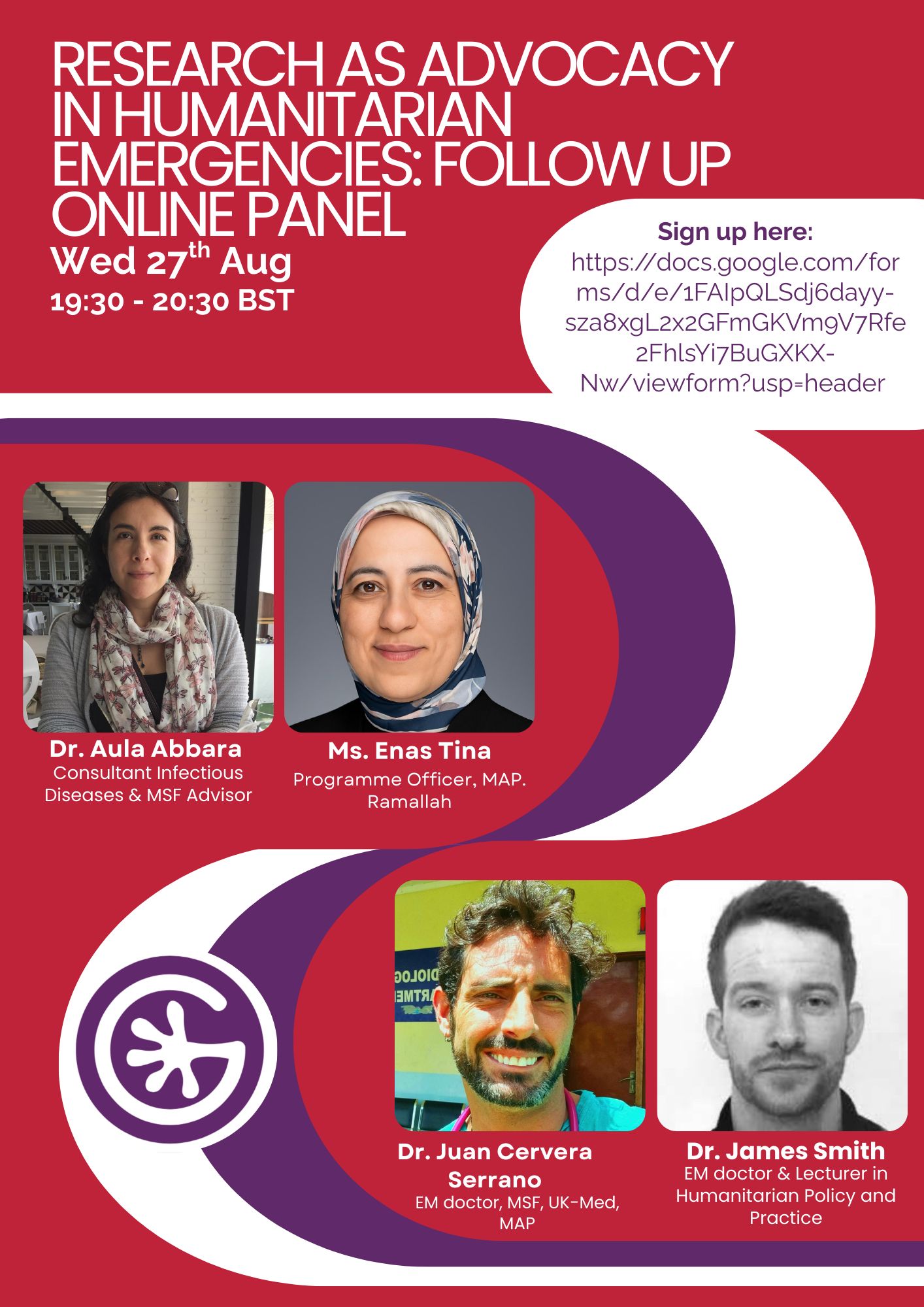 Finally, we came to our last panel session of the day, which was arguably our most thought-provoking as it covered research as advocacy in humanitarian emergencies. This subject has never been more pertinent during a period in world history where research evidence is both crucial and yet finds itself struggling to make the advocacy inroads to create a shift in both policy and geopolitics so that human health is protected. We were joined again by Aula Abbara alongside Yasmeen Iraqi (Research and Policy Office at Medical Aid for Palestinians (MAP)), James Smith (EM doctor, Lecturer in Humanitarian Policy and Practice, London), and Juan Cervera Serrano (EM doctor, MSF, UK-Med, MAP). Once again, challenges gaining a UK visa prevented Enas Tina (Medical Program Officer, also with MAP), who had planned to join us from Ramallah, from giving her presentation. The presentations gave examples specifically from Syria, Gaza, and the West Bank where research evidence has been used and presented to different audiences. Speakers highlighted tensions of language within research materials and what is considered ‘palatable’ for a so-called scientific audience, which can easily slide into complicit dilution of fact. The strong message from all speakers was the importance of aiming for rigorous research approaches, transparent methodology, and unambiguous reporting. In this regard, the truth is then able to speak for itself without any framing or need for comfortable language. It was very much highlighted that despite the strongest evidence for attacks on healthcare with clear contraventions of international humanitarian law, we have entered a period of time where moving such evidence as advocacy into immediate and effective influence has very visibly stalled based on where geopolitical power lies. For those who claim that healthcare and politics should be kept separate, that utopian vision exists no more in the Occupied Palestinian Territories or Syria than it does in the UK.