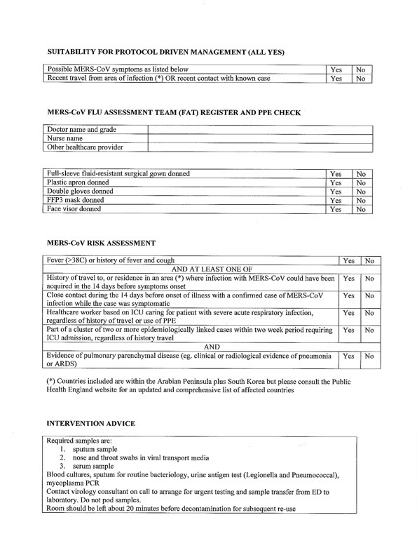 (Disclaimer: Please note that this work is adapted from our national guidance on MERS-CoV and adapted to our local settings. It might therefore NOT apply to your area of clinical practice as it stands!)